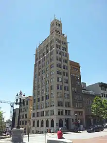 The Great Depression hit Asheville quite hard. On November 20, 1930, eight local banks failed.[40] Only Wachovia remained open with infusions of cash from Winston-Salem.[41] Because of the explosive growth of the previous decades, the per capita debt owed by the city (through municipal bonds) was the highest in the nation.[42] By 1929, both the city and Buncombe County had incurred over $56 million in bonded debt to pay for a wide range of municipal and infrastructure improvements, including City Hall, the water system, Beaucatcher Tunnel, and Asheville High School. Rather than default, the city paid those debts over a period of fifty years.[43]