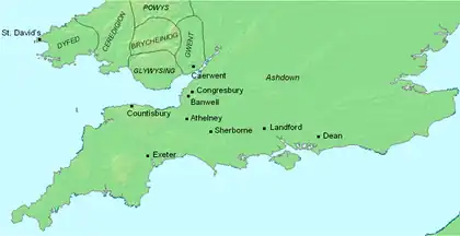 Asser (/ˈæsər/; Welsh: [ˈasɛr]; died c. 909) was a Welsh monk from St David's, Dyfed, who became Bishop of Sherborne in the 890s. About 885 he was asked by Alfred the Great to leave St David's and join the circle of learned men whom Alfred was recruiting for his court. After spending a year at Caerwent because of illness, Asser accepted.