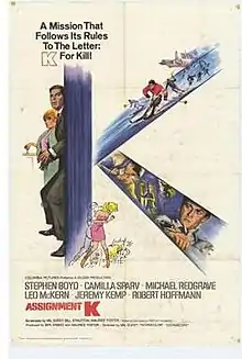 Assignment K is a 1968 British spy thriller film directed by Val Guest in Techniscope and starring Stephen Boyd, Camilla Sparv, Michael Redgrave, Leo McKern, Robert Hoffmann and Jeremy Kemp.[1] The film was based on the 1964 novel Department K by Hartley Howard.