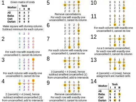 Worked example of assigning tasks to an unequal number of workers using the Hungarian method