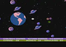 The view then cuts to space, where the player uses the joystick to cause the screen to rapidly scroll in the selected direction, creating the illusion of flight. The screen is filled with planets and other objects. When the user presses the fire button on the joystick, the stick stops causing the ship to move, and instead fires its weapon in the chosen direction. The ship can simultaneously move and fire in different directions.