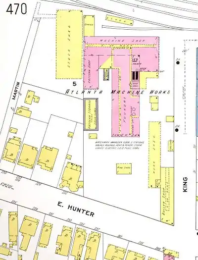 The Atlanta Machine Works was early Atlanta's first foundry and metal fabrication company. in 1848, Austin Leyden together with Robert Findlay and others established a foundry, amassed a fortune and eventually sold the company, called A. Leyden & Co., in 1853 to a business partner. Thereafter it became known as the Atlanta Machine Works and went on to play a central role in the Civil War, producing weaponry and other goods for the Confederacy. The foundry was located at the northwest corner of Hunter (now Martin Luther King, Jr. Blvd.) and King streets,[1][2] now occupied by a larger industrial site only 495 metres (1,624 ft) from the Georgia State Capitol.