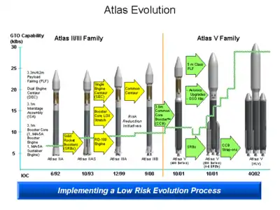 Atlas II was a member of the Atlas family of launch vehicles, which evolved from the successful Atlas missile program of the 1950s. The Atlas II was a direct evolution of the Atlas I, featuring longer first stage tanks, higher-performing engines, and the option for strap-on solid rocket boosters. It was designed to launch payloads into low Earth orbit, geosynchronous transfer orbit or geosynchronous orbit. Sixty-three launches of the Atlas II, IIA and IIAS models were carried out between 1991 and 2004; all sixty-three launches were successes, making the Atlas II a highly reliable space launch system. The Atlas line was continued by the Atlas III, used between 2000 and 2005, and the Atlas V which is still in use.