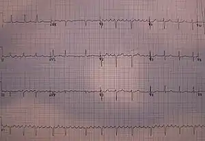 Atrial flutter (AFL) is a common abnormal heart rhythm that starts in the atrial chambers of the heart.[1] When it first occurs, it is usually associated with a fast heart rate and is classified as a type of supraventricular tachycardia.[2] Atrial flutter is characterized by a sudden-onset (usually) regular abnormal heart rhythm on an electrocardiogram (ECG) in which the heart rate is fast. Symptoms may include a feeling of the heart beating too fast, too hard, or skipping beats, chest discomfort, difficulty breathing, a feeling as if one's stomach has dropped, a feeling of being light-headed, or loss of consciousness.