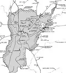 Starting in the 1850s during the California Gold Rush, the city of Sacramento rapidly grew around the confluence of the Sacramento River and its tributary the American River, near the middle of the Central Valley of California. The city's increasing population necessitated the construction of an extensive system of levees on the two rivers to prevent flooding. These early flood control works were insufficient; in 1862, the city was inundated so completely that the state government was temporarily moved to San Francisco.[3] In 1955, the U.S. Army Corps of Engineers built the Folsom Dam at the confluence of the North and South Forks of the American River to provide flood control for the Sacramento metropolitan area.[4][5][6] However, the Folsom Dam, with a capacity of just 1 million acre feet (1.2 km3) compared to the annual American River flow of 2.7 million acre feet (3.3 km3), proved inadequate.[7] A flood in 1955 filled the Folsom Reservoir to capacity, before the dam was even completed; it has also filled many times since.[8] However, increased water uses and diversions, requirements for 200-year flood control, and joint system operations have increased seasonal flood capacity in Folsom Lake.[9]