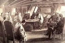 ![]() Franco-Anglo-Japanese conference on the Semiramis, 2 July 1863. Forefront: French interpreter Frederik Blekman, Japanese interpreter. Background (from left to right): Three Japanese governors of Yokohama, Duchesne de Bellecourt, daimyō Sakai-Hida-no-Kami, Colonel Neale (British representative in Japan), Admiral Jaurès, Admiral Kuper | |
