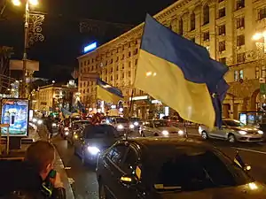 Automaidan (Ukrainian: Автомайдaн) is a pro-European Ukrainian socio-political movement involving the use of cars and trucks as means of protest that first began in late 2013 in Kyiv within the advent of Euromaidan.
