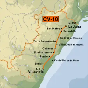 The Autovía CV-10, also called Autovía de la Plana, is a Spanish motorway in the Valencian Community. It runs through the province of Castellón from south to north, connecting the A-7 in La Vilavella with the N-232 in La Jana.
