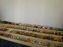 The avarca (Catalan pronunciation: [əˈβaɾkə], plural avarques) is a type of sandal popular in the Balearic Islands (Spain), especially Menorca. The shoes are made using a leather upper and a rubber sole.[1] Avarca is a traditional sandal originally developed in Menorca in the Balearic Islands. They were originally made from a leather upper and with the sole made from a recycled car tyre. Nowadays however the soles are made in the style of a car tire but from a purpose made mould. These are hard wearing and much lighter in weight than the original car tire sole. Only original avarca manufacturers are granted with the label "Avarca de Menorca". This label is granted by local Government and guarantees that avarcas accomplishes minimum quality standards and avarcas are really manufactured in Menorca island.[2]