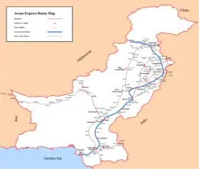 Awam Express (Urdu: عوام ایکسپریس) is a suspended passenger train operated daily by Pakistan Railways between Karachi and Peshawar. It is one of the longest continuous running passenger trains in Pakistan.[1] Pakistan Railways resumed its operation on 20 December 2023, after suspending during the 2022 [2]. The trip took approximately 33 hours and 30 minutes to cover a published distance of 1,732 kilometres (1,076 mi), traveling along the entire stretch of the Karachi–Peshawar Railway Line.