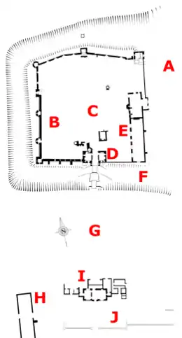 To the south-east, off the inner court, are the remaining earthworks of a formal garden on a raised platform, 80 by 65 metres (262 by 213 ft) across.[31] The garden had a raised walkway round a square pond, 35 by 32 metres (115 by 105 ft) in size.[31]