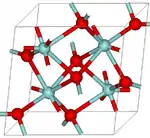 The coordination number for ZrO2 has been found to be 7. The mineral has two types of separations. The first being the seven shortest Zr-O, ranging from 2.04 to 2.26 Å, and the second Zr-O separation is 3.77 Å. Because of this, the coordination of baddeleyite was determined to be sevenfold. Baddeleyite's structure is a combination of tetrahedrally coordinated oxide ions parallel to (100) with triangular coordinated oxide ions. This explains baddeleyite's tendency to twin along the (100) planes. It has been observed that baddeleyite without twinning is extremely rare.[9]