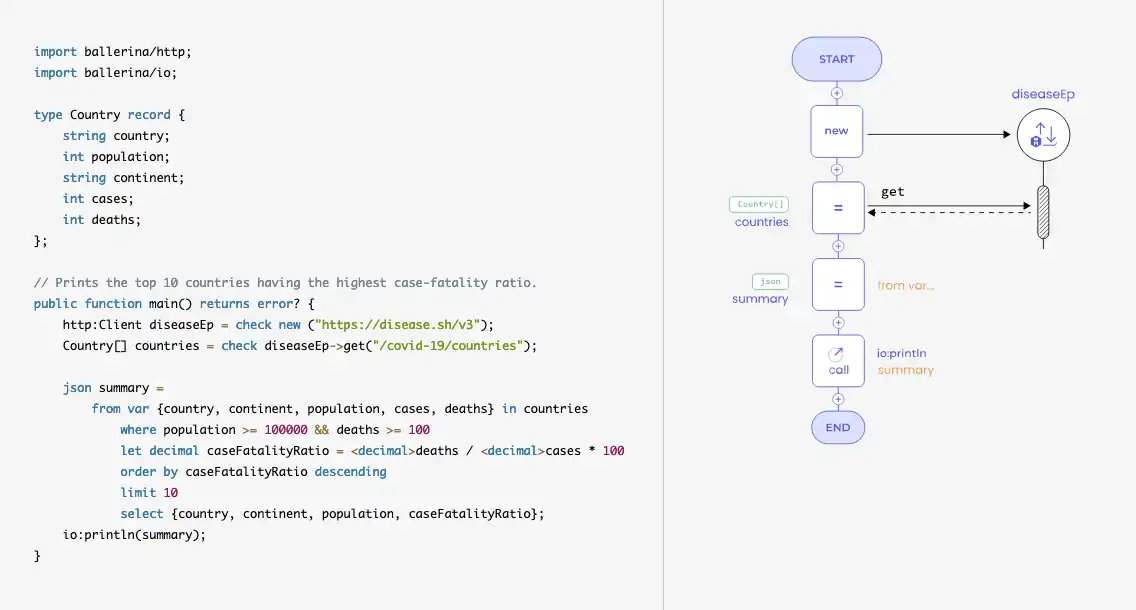 Ballerina is a general-purpose language with a familiar syntax along with a direct graphical representation of the code in the form of sequence diagrams. It has fundamental abstractions designed to make integration problems easier to program.[11] Ballerina was designed by WSO2 to improve productivity for application developers that have to work with distributed computing. It is easy to write and modify and is suitable for application programmers.[12][13][14]