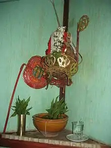 The Bamar also profess a belief in guardian nats, particularly the veneration of Mahagiri, the household guardian nat.[40] Bamar households traditionally maintain a shrine, which holds a long-stemmed coconut called on-daw (အုန်းတော်), symbolic of Mahagiri.[40] The shrine is traditionally placed at the home's main southwest pillar (called yotaing or ရိုးတိုင်). The expression of Burmese folk religion is very localised; the Bamar in Upper Myanmar and urban areas tend to propitiate the Thirty-Seven Min, a pantheon of nats who are intimately linked to the pre-colonial royal court.[40] Meanwhile, the Bamar in Lower Myanmar tend to propitiate other local or guardian nats like Bago Medaw and U Shin Gyi.[40] Spirit houses called nat ein (နတ်အိမ်) or nat sin (နတ်စင်) are commonly found in Bamar areas.