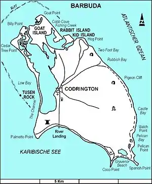 Since the period of British rule, the community-driven relationship with the land has been maintained through a communal land tenure system.[8] In 1685, the Crown leased the island to Christopher Codrington. This lease lasted until 1898.[9] The largest town on the island is named after Codrington.