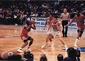 ![]() Chris Dudley (#22), playing for the New Jersey Nets, squares off with Michael Jordan (#23), of the Chicago Bulls on March 28, 1991. Other players including Chicago's Bill Cartwright (#24) are present on the court. | |
