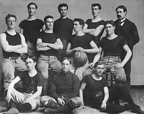 Women's basketball began in 1892 at Smith College when Senda Berenson, a physical education teacher, modified Naismith's rules for women. Shortly after she was hired at Smith, she went to Naismith to learn more about the game.[29] Fascinated by the new sport and the values it could teach, she organized the first women's collegiate basketball game on March 21, 1893, when her Smith freshmen and sophomores played against one another.[30] However, the first women's interinstitutional game was played in 1892 between the University of California and Miss Head's School.[31] Berenson's rules were first published in 1899, and two years later she became the editor of A. G. Spalding's first Women's Basketball Guide.[30] Berenson's freshmen played the sophomore class in the first women's intercollegiate basketball game at Smith College, March 21, 1893.[32] The same year, Mount Holyoke and Sophie Newcomb College (coached by Clara Gregory Baer) women began playing basketball. By 1895, the game had spread to colleges across the country, including Wellesley, Vassar, and Bryn Mawr. The first intercollegiate women's game was on April 4, 1896. Stanford women played Berkeley, 9-on-9, ending in a 2–1 Stanford victory.