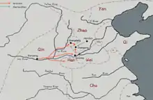 In 265 BC, Qin attacked the State of Han and captured Qinyang, which effectly cut off Han's Shangdang Commandery (in modern-day Changzhi, Shanxi province) from its southern heartland (in modern western Henan), making Shangdang an isolated northern exclave. Within the following years, the Qin army further isolated Shangdang from Han by capturing the crucial mountain passes and fortresses across the Taihang Mountains, and Shangdang was poised to fall.