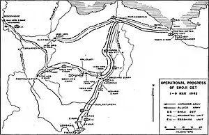 During the Dutch East Indies campaign, following the Japanese capture of cities and islands outside Java (e.g. Tarakan, Balikpapan and Palembang), the Japanese command began preparations for the invasion of Java, which would involve the Sixteenth Army.[1] As part of the Japanese planning, a key objective was determined: the Kalijati Airfield close to Java's north coast, which was to be taken despite of risks involved.[2] Part of Java's invasion force (the 2nd Division and elements of the 38th Division) were assembled at Cam Ranh Bay to land in West Java, while the 48th Division was designated to land in East Java after moving through the Makassar Strait.[3]