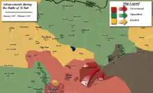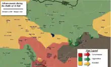 After failing to penetrate al-Bab from the north or west, rebel and Turkish forces started assaults from the east.[129] On 8 January, Turkish-backed rebels captured Um Adasa and Makri Hill near Bizaah.[130] The next day, the rebels once again advanced near Bizaah, capturing Zammar and Asfar Tepe.[131] With these advances, the rebels were attempting to flank al-Bab from the east.[132] Still, in the period between 1 and 14 January, the rebels made eight attempts to capture the nearby village of Al-Suflaniyah, with all of them being repelled.[133][134] At one point, on 13 January, the rebels managed to capture Suflaniyah temporarily,[135] but had to retreat from it after an ISIL counter-attack.