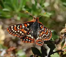 • from other subspecies such as the Quino checkerspot (Euphydryas editha quino) or the Mono Lake checkerspot (Euphydryas editha monoensis) by having black bands that give the Bay checkerspot a much more checkered appearance than they have.[4]
