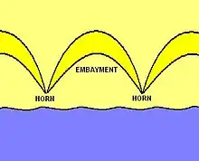 They can be found all over the world and are most noticeable on shorelines with coarser sediment such as pebble beaches. However, they can occur with sediment of any size. They nearly always occur in a regular pattern with cusps of equal size and spacing appearing along stretches of the shoreline. These cusps are most often a few metres long. However, they may reach 60 m (200 ft) across. Although the origin of beach cusps has yet to be proven, once cusps have been created they are a self-sustaining formation. This is because when an oncoming wave hits the horn of a beach cusp, it is split and forced into two directions. The crashing of the wave into the cusps slows its velocity, causing coarser sediment to fall out of suspension and be deposited on the horns. The waves then flow along the embayments (picking up finer sediment) and run into one another in the middle. After this collision these waves attempt to flow back out to sea where they are met by incoming waves. Therefore, once the cusp is established, coarser sediment is constantly being deposited on the horn and finer sediment is being eroded away from the embayments.[1] This process causes the horners and embayments to at least maintain their size, if not grow larger.
