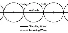 The antinodal point is where all the movement takes place as the water rises and falls, creating a series of peaks and troughs. Between these antinodal points are the nodal points where no vertical movement takes place. An incoming wave has an almost uniform height but when it collides with a standing edge wave, this is changed. If it collides with a peak, then the wave height is increased and if it collides with a trough, then its height is decreased. In the adjacent diagram, the two waves cancel each other out, creating a flat surface. However, this is a highly simplified version of events. The incoming wave has the same wave period as the edge wave, so the incoming wave changes from a peak to a trough over the same period as it takes the standing wave to change so they keep the same pattern. These are known as synchronous waves and are very uncommon.