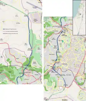 The road follows a south-north path that connects key neighborhoods and commercial areas, as well as several city arteries and national routes. Beginning at the Rosmarin Interchange (formerly the Tunnels Junction) of the Gush Road in Gilo, the road arcs north-westward through Gilo, Beit Safafa, and Sharafat turning northward through Malha. Passing Golomb Blvd, the road travels below a high ridge to the west on which sits the Holyland Park building complex. To the east is Emek Hatzva'im (Gazelle Valley), a green zone that was previously leased to Kiryat Anavim and Ma'ale HaHamisha and used for agricultural purposes.[1] Further on, the path was excavated to create a depressed roadway between Bayit Vegan, Givat Mordechai, Ramat Beit HaKerem and Givat Ram. This section is equipped with noise barriers and speed cameras.[2]