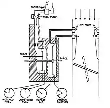 At the same time, air entering the carburetor compresses the air in the impact tubes, generating a positive pressure in chamber B that is proportional to the density and speed of the air entering the engine. The difference in pressure between chamber A and chamber B creates the air metering force which opens the servo valve allowing the fuel into the fuel regulator.[14]