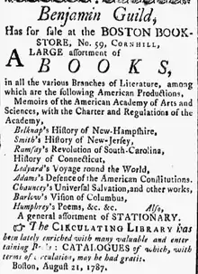 Guild sold books from his shop at no.8 State Street from around 1785 until 1786, when he moved to Cornhill (1786-1792).[12] In addition to the bookshop, he ran a circulating library, one of the first in post-war Boston. The library contained "several thousands" of volumes, which, according to its 1787 newspaper advertisement "will furnish such a fund of amusement and information as cannot fail to entertain every class of readers ... whether solitary or social -- political or professional -- serious or gay."[13] Subscribers paid eight dollars per year, or "two dollars per quarter -- to have the liberty of taking out two books at a time and no more -- to change them as often as the subscriber pleases -- and no book to be retained longer than one month."[14] Guild stipulated that "any book lost, abused, leaves folded down, writ upon or torn, must be paid for."[14] After his death in 1792, Guild's bookshop and library were taken over by William P. Blake.[15]