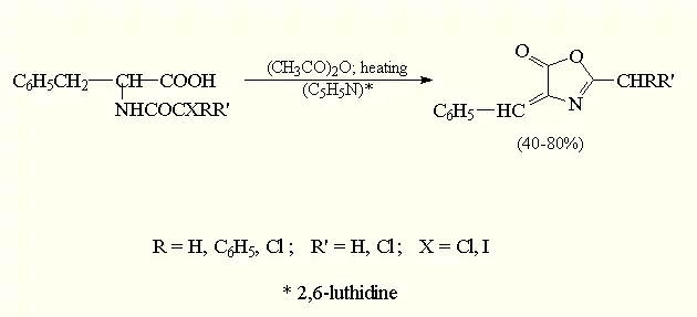 The last step in this reaction is the cyclization of the N-haloacylamino acids with an acetanhydride. This will result in the expected azlactone (3).[5]