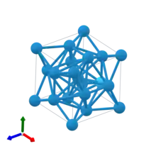 β-W has a cubic A15 structure with space group , which belongs to the Frank–Kasper phases family. Each unit cell contains eight tungsten atoms. The structure can be seen as a cubic lattice with one atom at each corner, one atom in the center, and two atoms on each face. There are two inequivalent tungsten sites corresponding to Wyckoff positions and , respectively. On the first site, Wyckoff position , each tungsten atom is bonded to twelve equivalent W atoms to form a mixture of edge- and face-sharing WW12 cuboctahedratungsten. On the second site, with Wyckoff position , each tungsten atom is bonded to fourteen neighboring tungsten atoms, and there is a spread of W–W bond lengths ranging from 2.54 to 3.12 Å.[12] The experimentally measured lattice parameter of β-W is 5.036 Å,[6] while the DFT calculated value is 5.09 Å.[12]