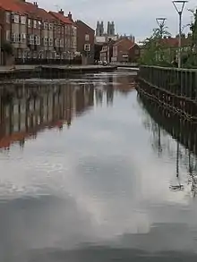 Beverley Beck was first mentioned in 1296, when the Archbishop of York sought to have fish-weirs removed from the River Hull, so that boats could reach Beverley. Grovehill, formerly known as Grevale and located near the junction with the River Hull, was used as a mooring place for barges. The agreement that the Archbishop had made with the fish-weir owners was then transferred to the burgesses of the Beverley Corporation, and by 1344 the Beck was navigable as far as Beverley.[1] The first known accounts, for scouring and cleansing of the Beck date to this year.[2] The Corporation assumed that they had a monopoly on the waterway, and leased it to tenants, who then had to provide two boats in which all cargo was carried. This changed to a system of tolls from 1704, which allowed other boats to use the Beck.[1] The wharf at Grovehill was later converted into a lock.[3]
