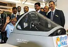 The Chief of the Air Staff, Air Chief Marshal Arup Raha in a HAWK MK 132 simulator at Hindustan Aeronautics Ltd., during the Aero India-2015, in Bangalore on 19 February 2015.