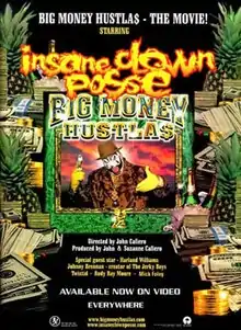 Big Money Hustlas is a 2000 American comedy film directed by John Cafiero as his feature film debut. The film, a homage to exploitation films of the 1970s, focuses on a streetwise San Francisco detective who tries to take down a New York City crime lord. It stars Insane Clown Posse's Joseph "Violent J" Bruce and Joseph "Shaggy 2 Dope" Utsler, and Twiztid's Jamie Madrox and Monoxide Child, and features appearances by Harland Williams, Johnny Brennan, Rudy Ray Moore, Mick Foley and the Misfits. Released direct-to-video, the film debuted at #1 on Billboard's Top Music Videos chart, and was later certified platinum by the RIAA. A Western genre follow-up, Big Money Rustlas, was released direct-to-video on August 17, 2010. In 2015, Insane Clown Posse announced the production of a sequel entitled Big Money Thrusters.