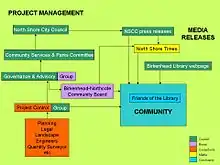 In the local paper, the North Shore Times, there was a steady clamour from both opponents of the project and those in favour.[77] In addition to issues with the new library itself, the council's performance was questioned, concern was raised about the drop-off in existing library services, and the library project was linked to the ongoing redevelopment in the whole of the Birkenhead town centre.[78]