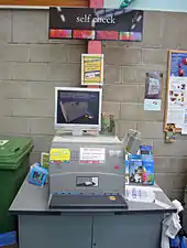 Notable too in the late eighties, was the processing of books to create "machine readable codes,"[20] which saw the catalogue shifted from card to microfiche.[21] Borrowers were now directly registered onto the computer, and a new computer management system went live, "the most sophisticated...in the world."[22] This was a forerunner of the greater computerisation ahead, including the introduction of self-issue machines in 1995 (pictured), internet access in 1996 and a widening range of electronic resources from 2002.[23][24][25]