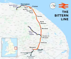 The Bittern Line is a railway branch line in Norfolk, England, that links Norwich to Sheringham.[1] It passes through the Broads on its route to an Area of Outstanding Natural Beauty on the north Norfolk coast.[2] It is named after the bittern, a rare bird found in the reedy wetlands of Norfolk.