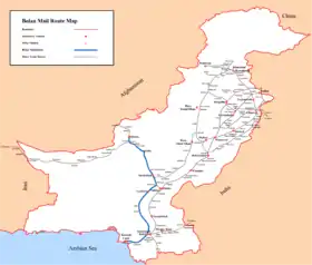 Bolan Mail (Urdu: بولان میل) is a passenger train operated daily by Pakistan Railways between Karachi and Quetta.[1] The trip takes approximately 20 hours 25 minutes to cover a published distance of 916 kilometres (569 mi), running at 45 kilometres per hour (28 mph) & traveling along a stretch of the Karachi–Peshawar Railway Line, Kotri–Attock Railway Line and Rohri–Chaman Railway Line. The train is named after the famous Bolan Pass, a strategically located pass connecting to Central Asia. The train was closed after 2022 floods, after a long time this train is finally restored on 25 December 2023,[2].Currently, the train is running on alternate days with only one rake. Ac dinning car has been added in this train.