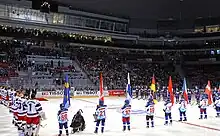 In order to test the arenas built for the Olympics, the Bolshoy Ice Dome served as one of the venues for the 2013 IIHF World U18 Championships.[17] It subsequently held the Channel One Cup from 19–22 December 2013 in final preparation before the start of the Games.[18] As the main venue for the 2014 Olympic ice hockey competition, the Ice Dome hosted most of the preliminary round games and almost all the playoff round matches for the men's tournament, while hosting solely the medal matches of the women's tournament.[19][20] On February 20, it held the gold medal match for the women's tournament, which saw Canada overcome a 0–2 deficit against the United States to tie the game with less than a minute of regulation time remaining, before scoring in overtime to secure their fourth consecutive Olympic gold medal.[21][22] The arena hosted the gold medal game of the men's tournament three days later on 23 February – the final gold medal of the 2014 Games up for contention – in which Canada defeated Sweden by a score of 3–0. In doing so, the Canadian team won an Olympic gold medal outside of North America for the first time in 62 years, became the first team since the Soviet Union in 1984 to finish the tournament with a perfect record,[23] the first team to successfully defend their gold medal since the Soviets in 1988, and the first to do both with the participation of NHL players, which started in 1998.[24]