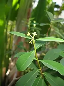 The main breeding season is from April to June.[6][14] Clutch sizes, of 3–4 eggs, are smaller than those of the Japanese greenfinch (3–6 eggs), though the eggs themselves are somewhat larger, weighing on average 1.99 grams (0.070 oz) as opposed to 1.8 grams (0.063 oz).[6][15] Its diet largely comprises seeds, for which it forages both on the ground and in shrubs and trees.[14] Among preferred species are Casuarina equisetifolia (as an alien tree, this has recently been eradicated[5]) and in particular Wikstroemia pseudoretusa; since the seeds of the latter are considerably larger than the grass seeds that comprise the majority of the diet of the Japanese greenfinch, it is thought that the larger beak of the Ogasawara greenfinch has evolved in response.[5][15]