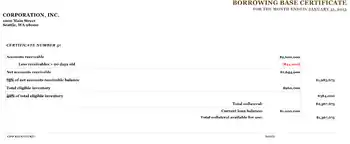Borrowing base certificate is the official accounting document prepared by the borrower that certifies the size of the borrowing base of an organization with the previously agreed advance rates.[11] Borrowing base certificate includes a summary calculation sheet. In its paper form, a borrowing base certificate is signed by the authorized representative of the organization, typically by the organization's CFO, as errors in the calculation of borrowing base can result in various penalties (loan interest rate increase, demand of early loan repayment, etc.)[25][26]