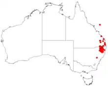 Bossiaea scortechinii grows in forest on sandy or granitic soils between Miriam Vale in south-eastern Queensland and Inverell in north-eastern New South Wales.[2][3]
