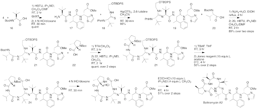 The total synthesis of bottromycin was accomplished in 2009.[4] The synthesis was achieved in 17 steps. Although bottromycin is a peptide-based natural product, it contains an unusual macrocycle and thiazole heterocycle, so that the total synthesis could not be accomplished using traditional solid-phase peptide synthesis. The synthesis was accomplished using a combination of peptide coupling and other methods. To obtain the primary thia-β-Ala-OMe intermediate, a sequence of condensation, Mannich reaction, and palladium-catalyzed decarboxylation steps were performed. This intermediate was prepared stereoselectively. To obtain the amidine linkage, a tripeptide intermediate was coupled to a phthaloyl-protected thioamide via mercury-mediated condensation using mercury (II) trifluoromethanesulfonate (Hg(OTf)2) to yield a branched amidine intermediate. To obtain the final product macrocycle, macrolactamization of the amidine-containing intermediate was required. Macrolactamization was performed with 1-Ethyl-3-(3-dimethylaminopropyl)carbodiimide (EDCI) and iPr2NEt yielded the final product, bottromycin A2. To confirm that the synthesized bottromycin A2 had the same stereochemistry as natural bottromycin A2, the product was studied by optical rotation, 1H and 13C NMR, IR, and HRMS. The data was found to match that of isolated bottromycin A2. Further, the synthetic sample of bottromycin was also found to have antibacterial activity against both MRSA and VRE, although quantitative data was not reported. A full rendering of the synthetic scheme may be seen under the collapsed synthetic scheme link.