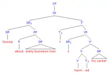 If a pronoun has a quantified expression as antecedent, the pronoun must be c-commanded by this antecedent.[3][4] An antecedent c-commands a pronoun if, when observing the structure of the sentence, a sister of the antecedent dominates the pronoun.[5]