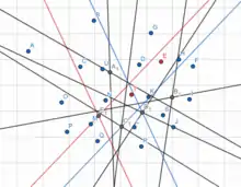 The points to be discarded are found as follows: The points Pi are arranged into pairs which defines lines pj as their bisectors. The median average pm of bisectors in order by their directions (oriented to the same half-plane determined by bisector p1) is found and pairs of bisectors are made, such that in each pair one bisector has direction at most pm and the other at least pm (direction p1 could be considered as − or + according our needs.) Let Qk be the intersection of the bisectors in the k-th pair.