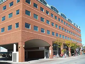 The Downtown Terminal is a Brampton Transit bus station serving the central area of Brampton, Ontario, Canada. It is located a block north of the intersection of Main Street and Queen Street, the two main streets in downtown. There is direct access to Via Rail and GO Transit trains at the adjoining Brampton GO Station. Municipal and private-sector partnerships funded this facility and built a six-storey office building above the transit terminal.[1] A portion of the ground level of the building accommodates ticket sales and a heated waiting room.
