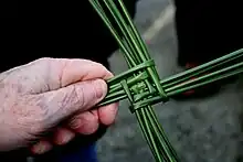 Unlike other Brigid's crosses, which were typically made of straw, the interlaced cross is often made of rushes. Unlike other forms of the cross which contain a woven shape in the centre, the interlaced cross consists only of rush or straw strands woven into a Christian cross shape.[8][9] While straw is the more popular weaving material for most variants of Brigid's cross, the interlaced cross is more frequently made from rushes.[1] An even simpler variant is the bare cross, which consists either of two bound plaits of straw or of two planks of wood bound together in the centre by straw.[10] Occasionally, no straw is used at all: the Sheaf-Cross, located in eastern County Galway and County Roscommon, involves two small sheathes of unthreshed corn are bound together by a split thatching branch.[11]