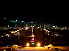The Brindavan Gardens is a garden located 12 k.ms from the city of Mysore[1] in the Mandya District of the Indian State of Karnataka. It lies adjoining the Krishnarajasagara Dam which is built across the river Kaveri.[2] The work on laying out this garden was started in the year 1927 and completed in 1932.[3][4] Visited by close to 2 million tourists per year, the garden is one of the major attractions of Srirangapatna.[5] Sir Mirza Ismail, the Deewan of Mysore, a man with a penchant for gardens, founded the Brindavan Gardens (Krishnaraja Sagar Dam in particular) and built the Cauvery River high-level canal to irrigate 120,000 acres (490 km2) in modern Mandya district. The gardens were designed by German botanist and landscape designer Gustav Hermann Krumbiegel.