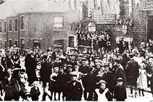 Broomfields developed a vibrant community and social life. The living rooms of the small houses were very restricted but the chapels, church halls, public houses and the streets themselves provided ample space. Twice a year Hall Lane was "en fete" for the "Spring Feast" and "Bowling Tide Week".[22] Bowling Tide (12 August) week was Bradford's general holiday. All mills and factories stopped work. The "Tide Field" next to Hall Lane was filled by the rides and roundabouts of the travelling showmen and with stalls, coconut shies and boxing booths.